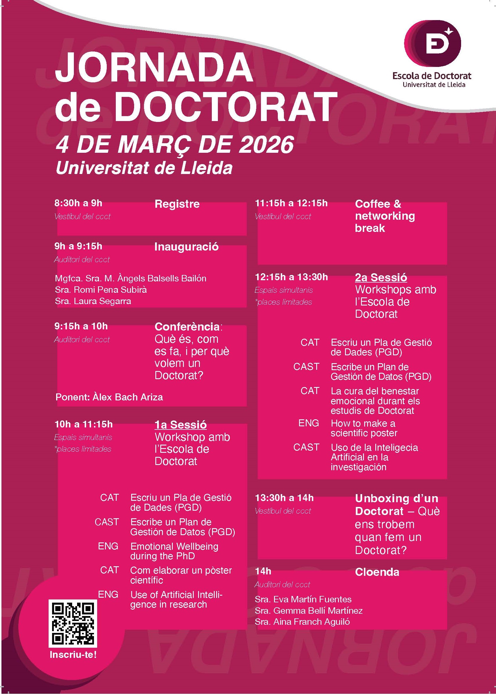 Inagurated by Mr. Jaume Puy Llorens, Lord Rector of this University, and closed by Mrs. Natàlia Alonso Martínez, vice-rector of Research; offered two conferences: